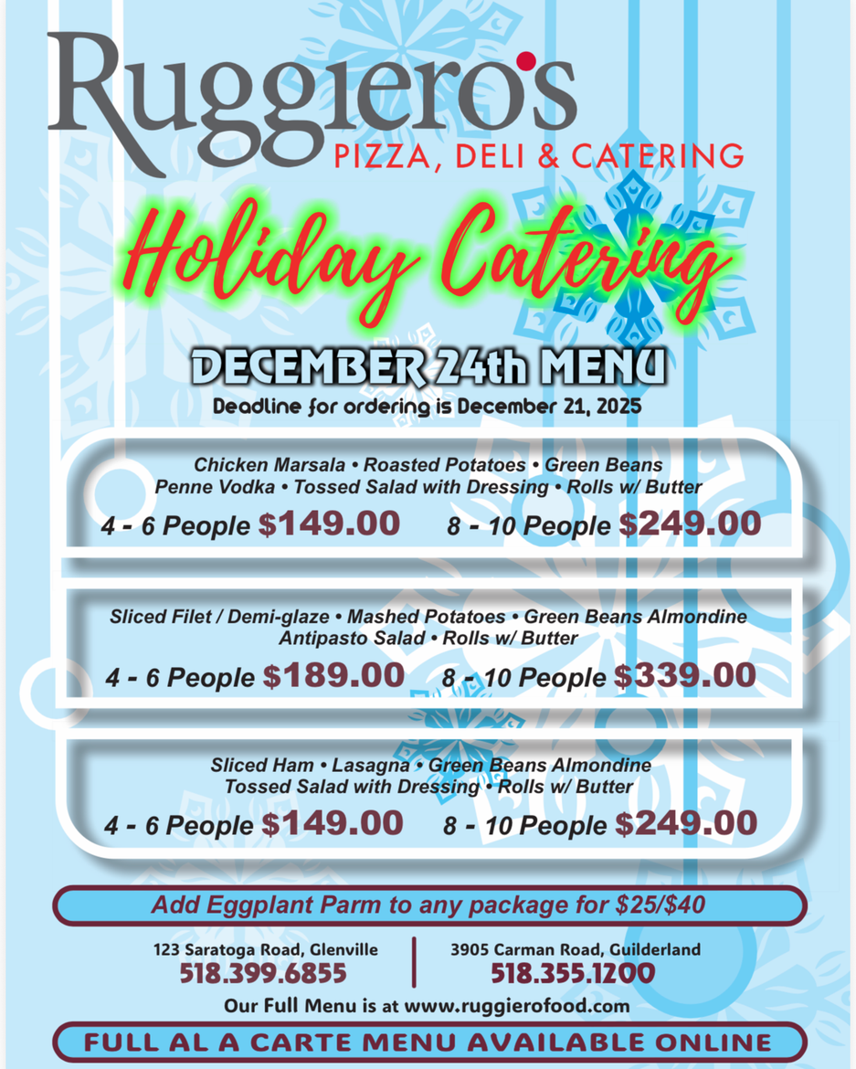 Since 1989, Ruggiero’s Pizza, Deli & Catering has been family-owned-and-operated, providing classic Italian dishes and specialties made from the freshest and finest ingredients. Due to many happy customers throughout the Albany, NY area, we were able to expand and open up a second location in Guilderland. We are proud to maintain a successful catering business for both our original Socha Plaza location and second location. For more than two decades, we’ve been providing an extensive lunch, dinner, and catering menu
